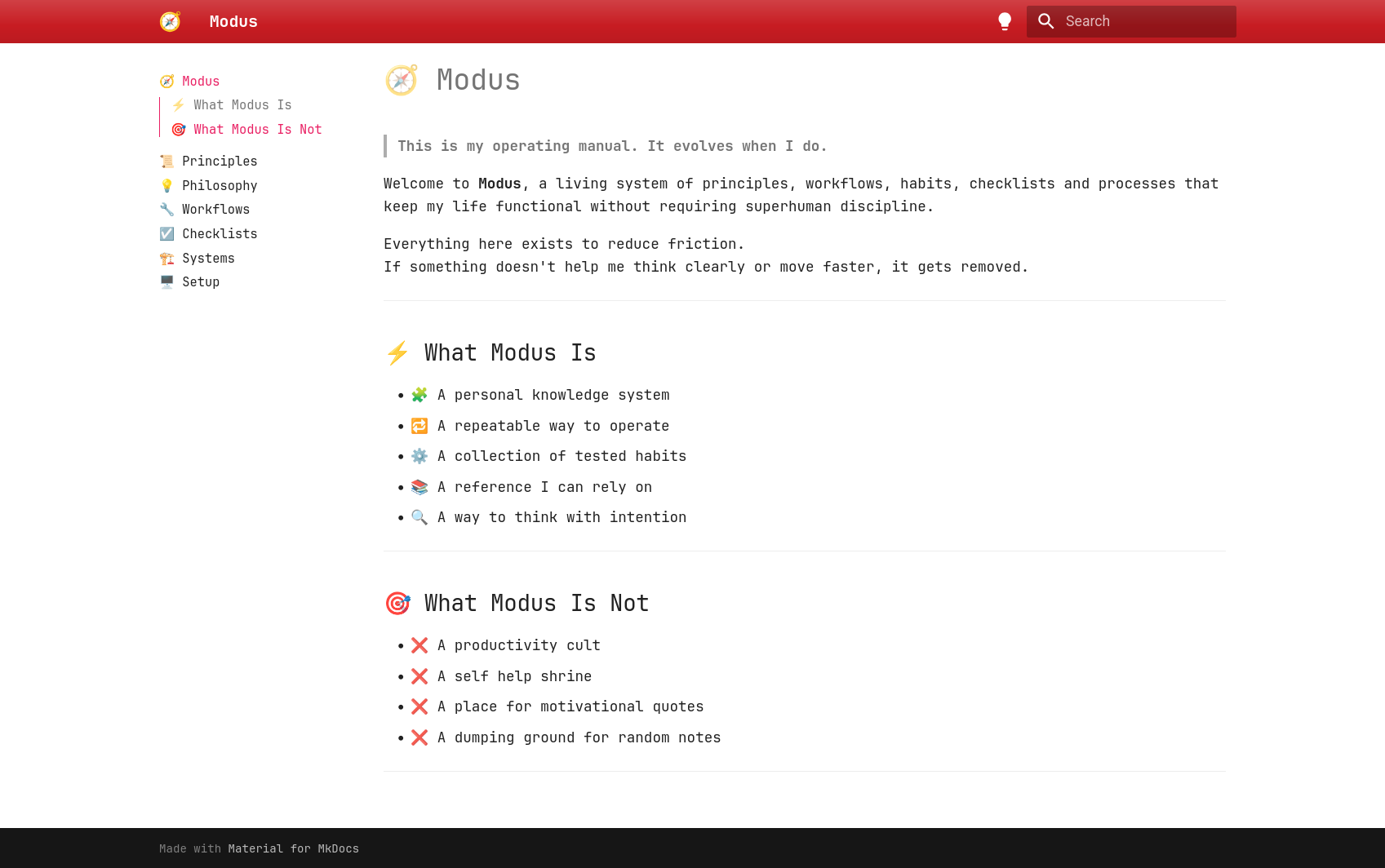 Modus is an MKDocs-powered documentation system used to store personal workflows, habits, principles, and evolving systems in a clear, navigable format.